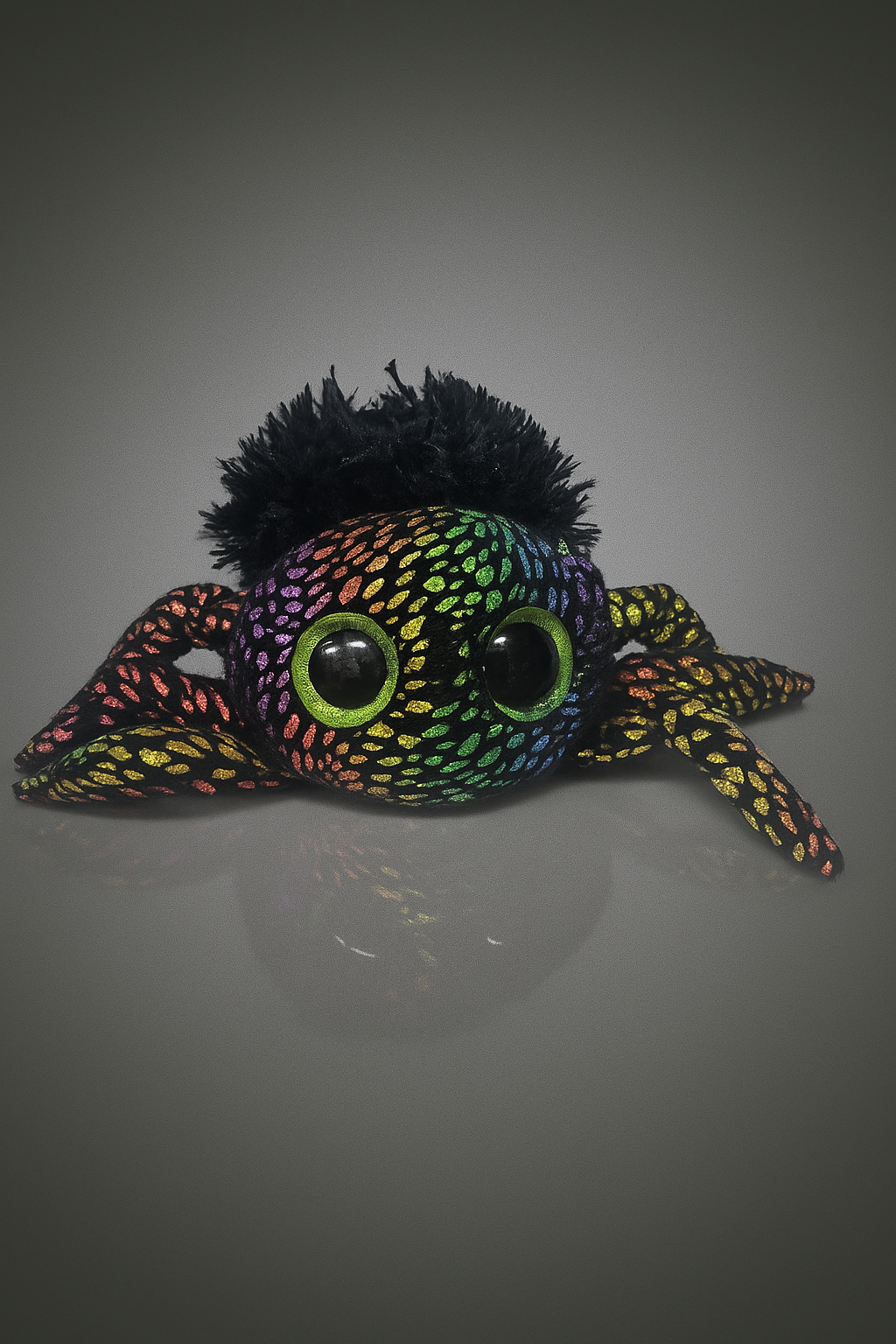 Gökkuşağı Desenli Peluş Örümcek, büyük parlak gözleri ve simsiyah kabarık saçıyla dikkat çekiyor. Renkli pullu desenleriyle geceyi gündüze çeviren bu minik kahraman; hem çocuklara eğlenceli bir arkadaş, hem de koleksiyon meraklıları için özel bir parça.